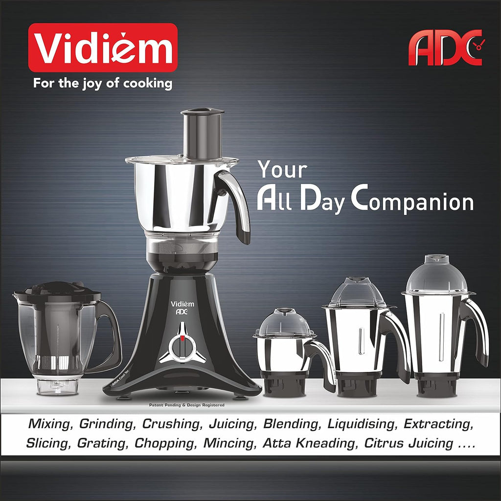 ✅ Vidiem ADC,mixer grinder 750 watt+ - Your All Day Companion Mixing, Grinding, Grating, Crushing, Juicing, Blending, Liquidising, Extracting, Thick & Thin Slicing, Chopping,Mincing, Coconut Grating , Atta Kneading, Citrus Juicing. 2 Litre Stainless Steel Multi Chef with Double reduction Gear Box for High Torque & Low Noise with Polycarbonate Lid.